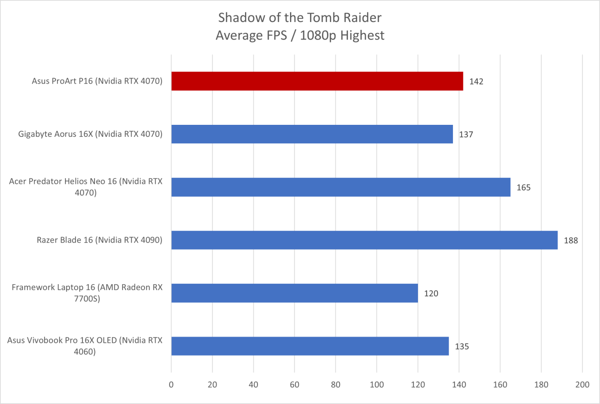 Shadow of the Tomb Raider is a good example of a demanding and graphically feature-rich game that came out of the PlayStation 4 / Xbox One console generation. It doesn’t pose much challenge for modern laptops even at 1080p and Highest detail, so the ProArt P16 happily churns out an average of 142 frames per second. That even matches some gaming laptops, such as the Gigabyte Aorus 16X.