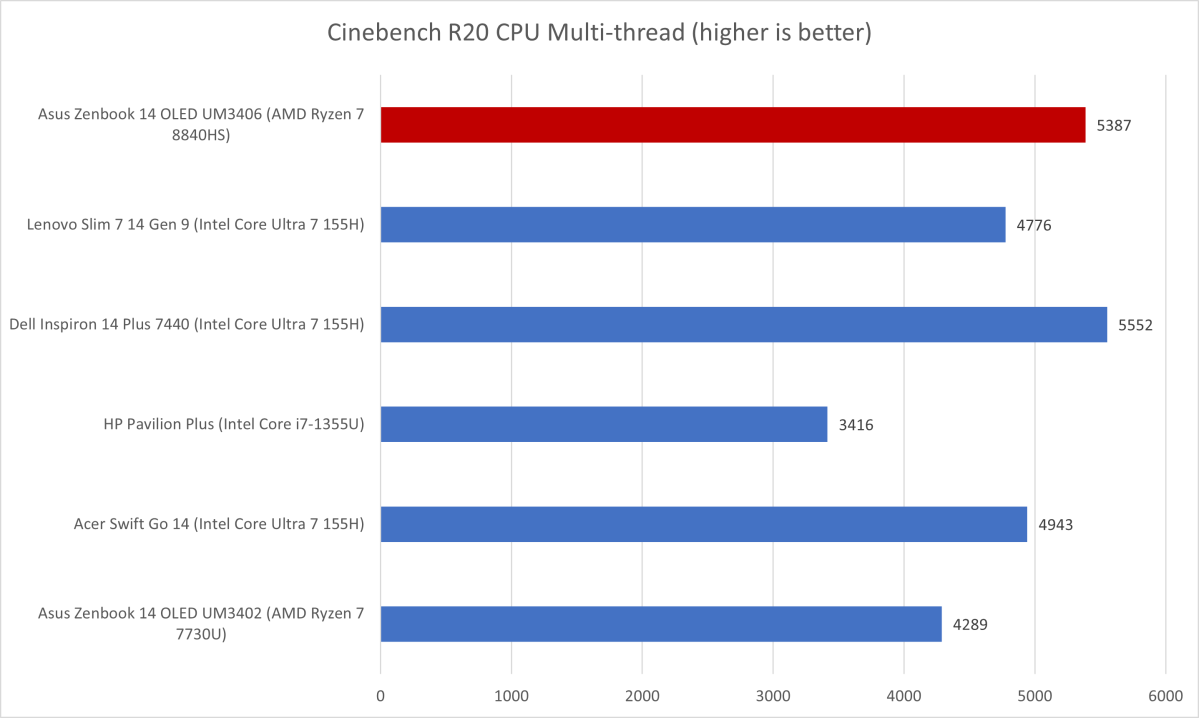 Cinebench R20, which is a short-duration, heavily multithreaded CPU benchmark, produces a result similar to PCMark 10. Once again, the Zenbook is a tad behind the Dell Inspiron 14 Plus, but it defeats other recently tested laptops with an Intel Core Ultra 7 155H processor. The new Zenbook enjoys a significant improvement over the older Ryzen 7 7730U, which we tested in last year’s Zenbook 14 OLED.