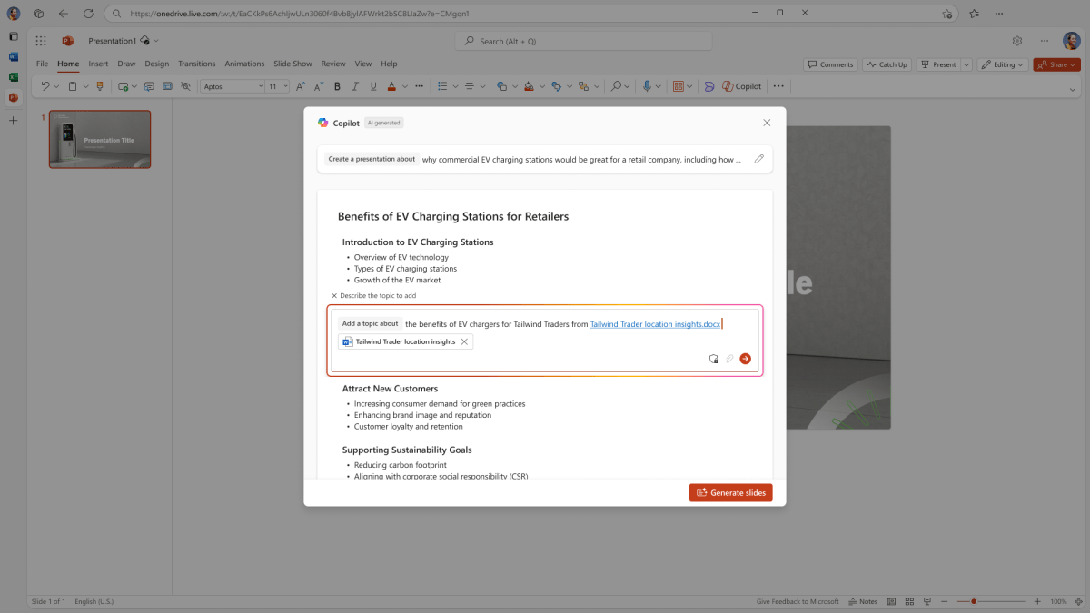 Copilot in PowerPoint: Narrative Builder is the latest feature within Copilot for PowerPoint, helping to come up with a “draft” presentation and then refine it until you’re satisfied with your product. Soon Copilot will also be able to add images from your SharePoint library and create approved branded presentations.