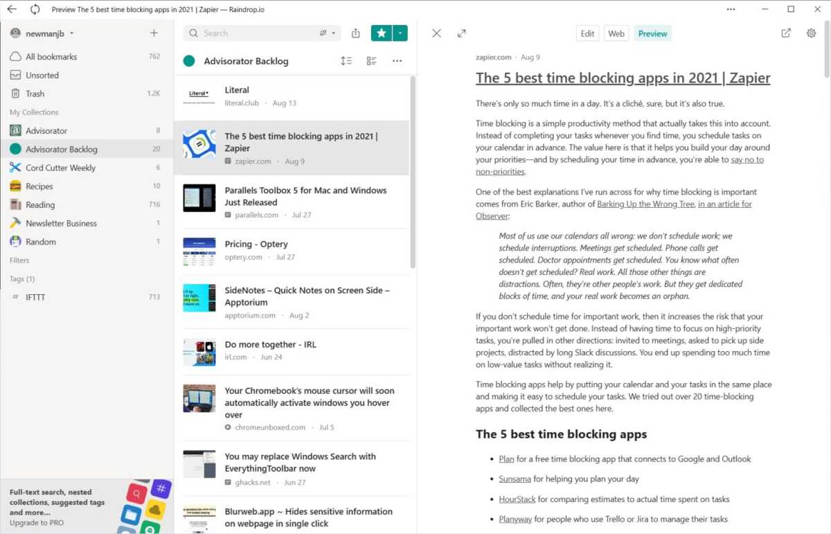 Raindrop goes well beyond the capabilities of browser-based bookmarking. You can mark each folder with its own icon, read articles in a distraction-free view, and share collections with others. But I mostly just like Raindrop for its comfortable, straightforward app design and the ability to use it across virtually any computing platform.